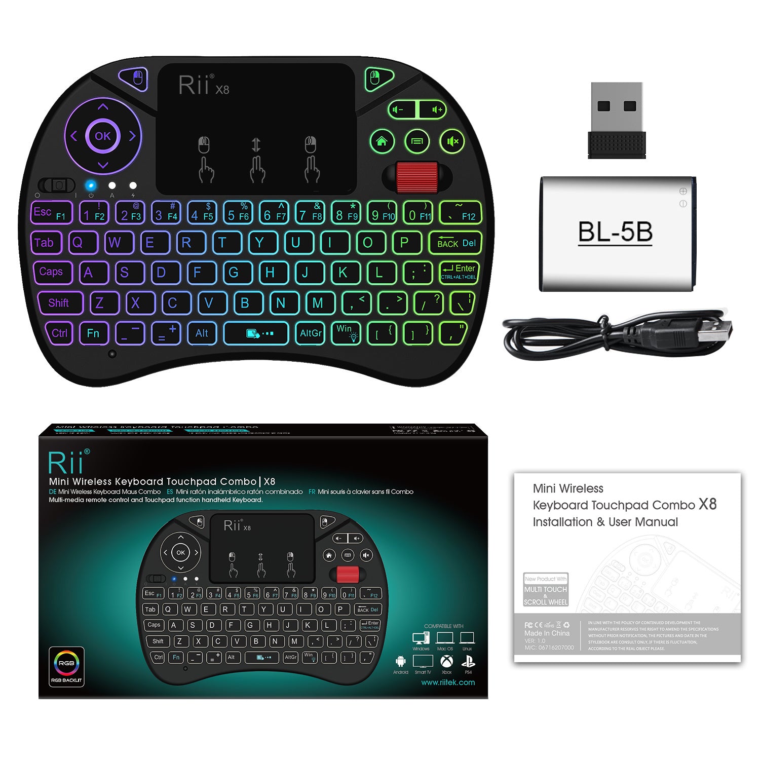 Rii X8 Portable 2.4GHz Mini Wireless Keyboard Controller with Touchpad Mouse Combo,8 Colors RGB Backlit,Rechargeable Li-ion Battery for Google Android TV Box, PS3, PC, Pad,Nvidia Shield